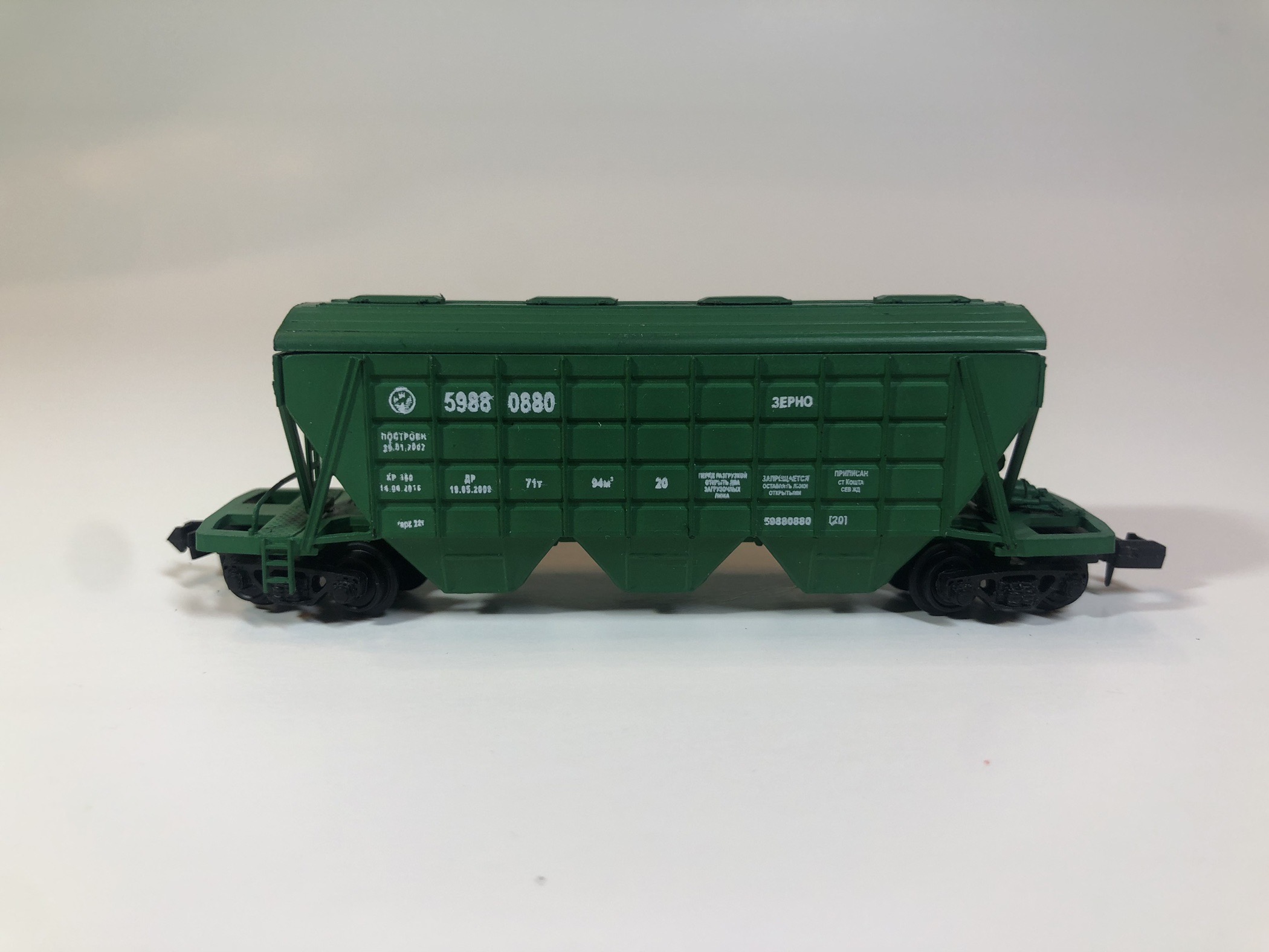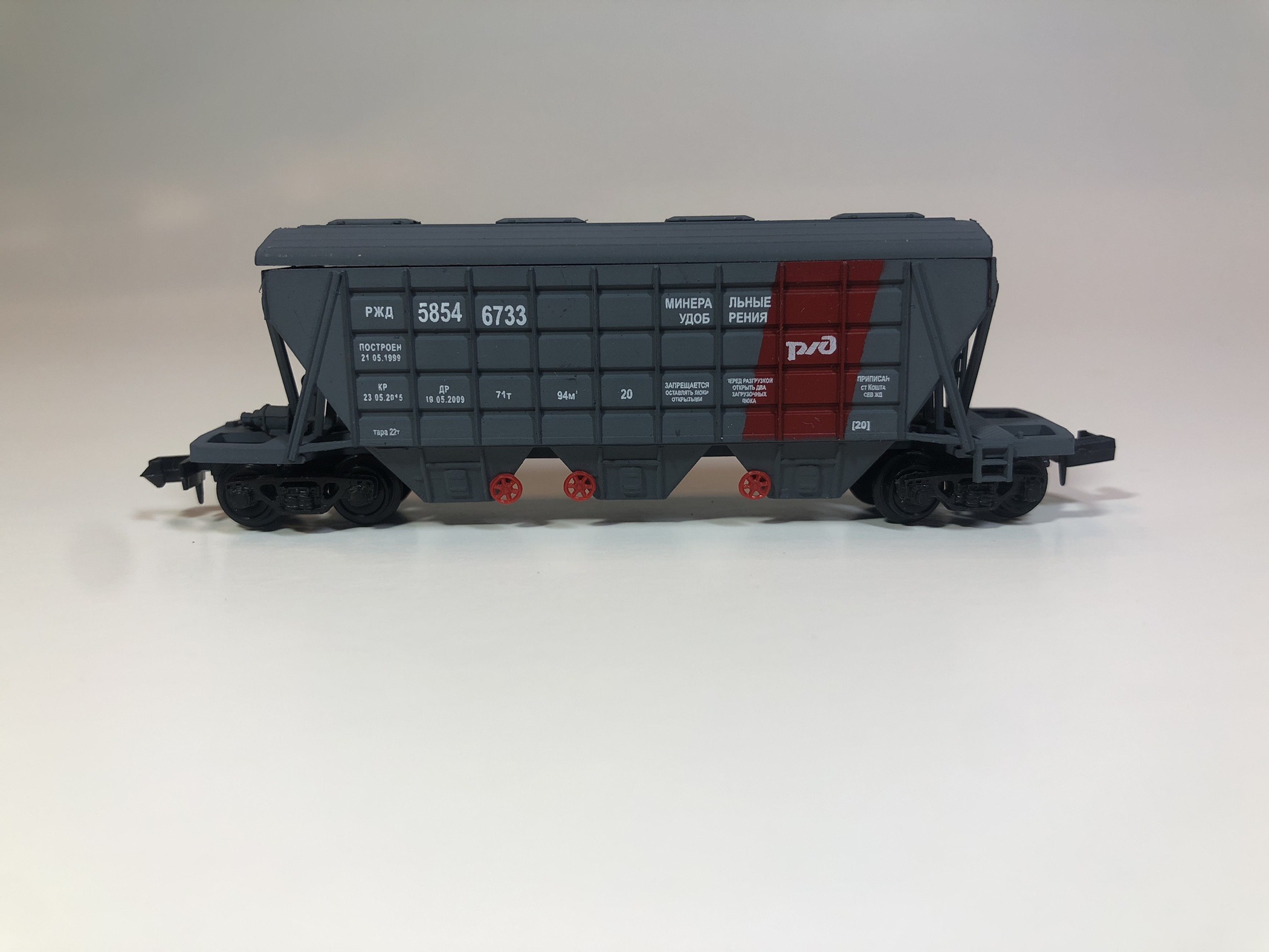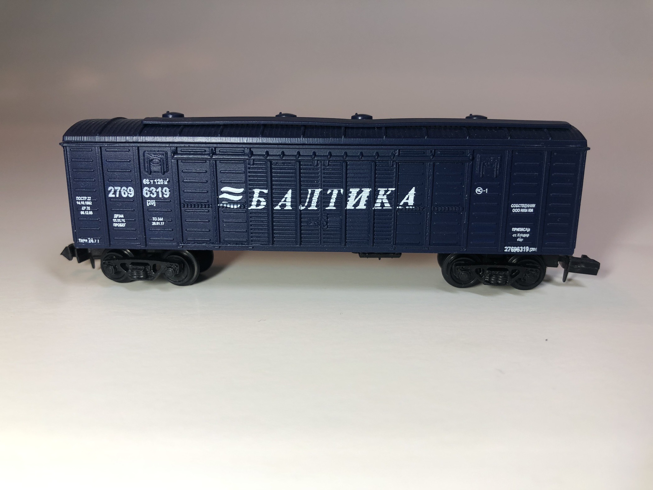 Крытый вагон. Материал - пластик, окраска - автомобильные краски, надписи - тампография (краска), колпары - пластик (межосевое для замены на металлические колеса - от 14,0 до 14,7 мм)